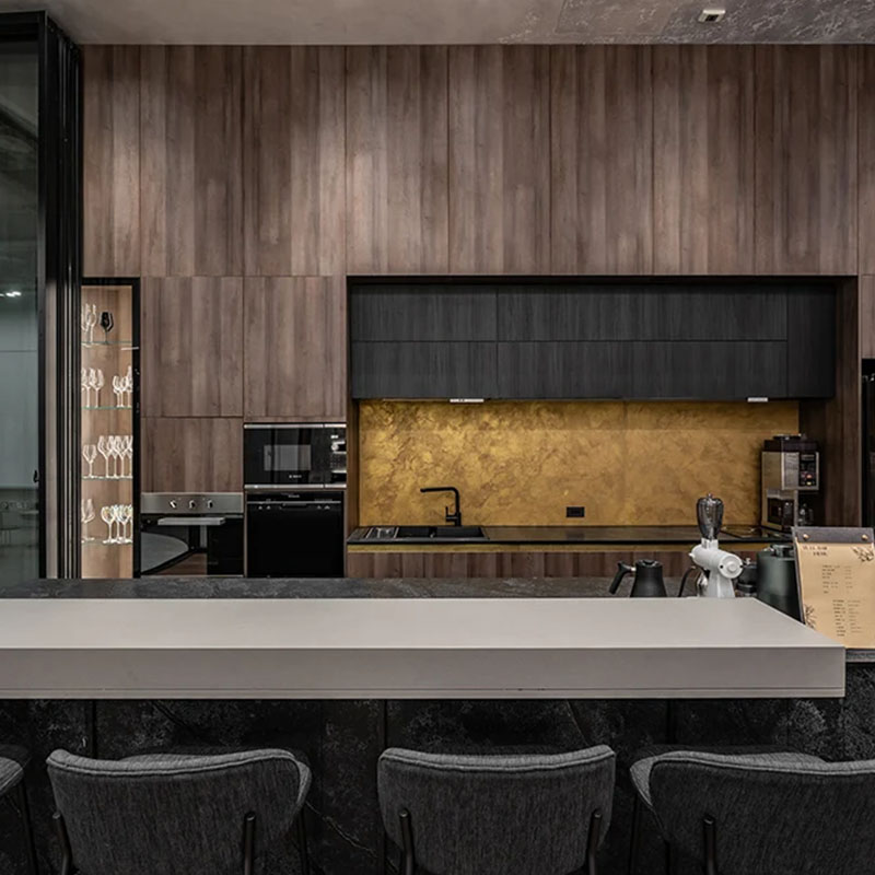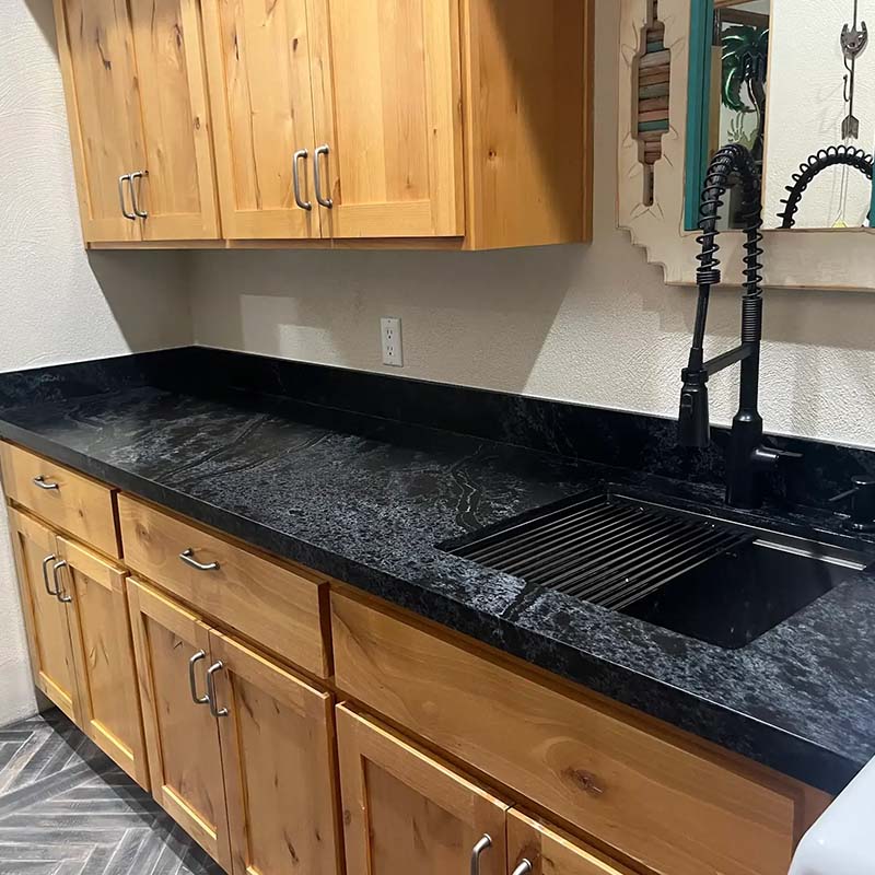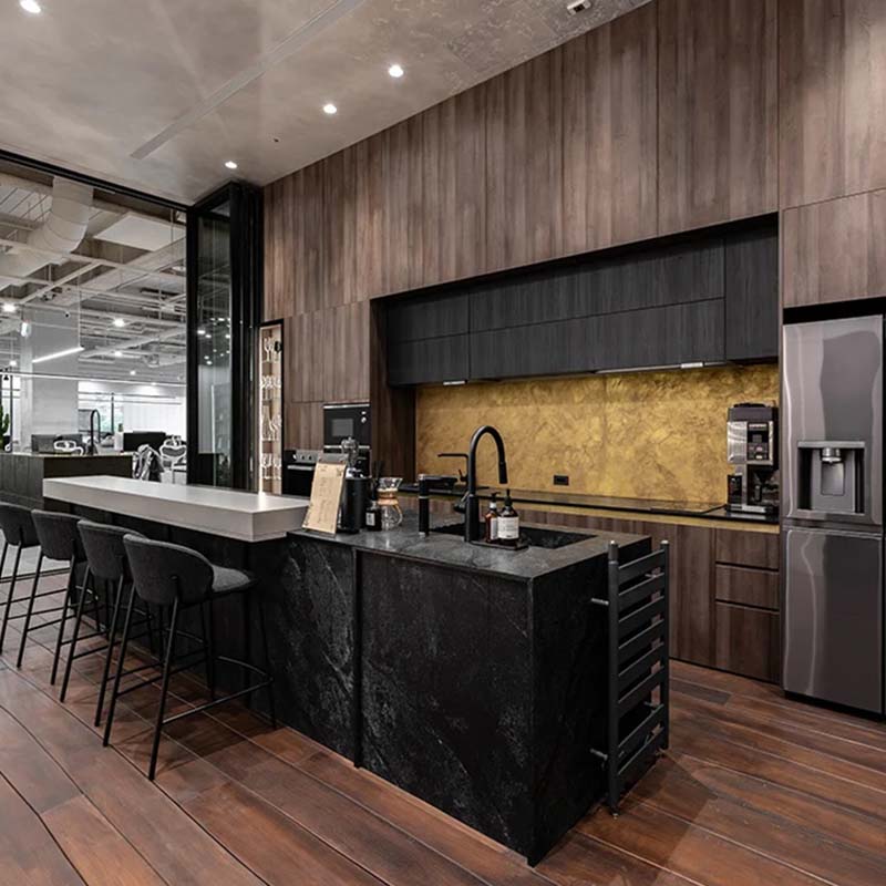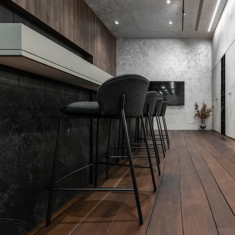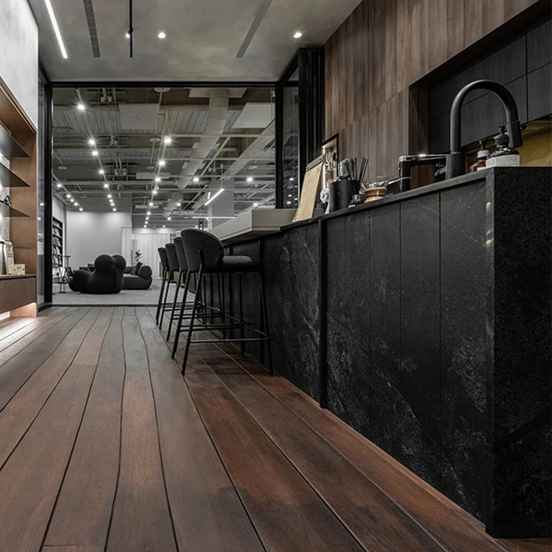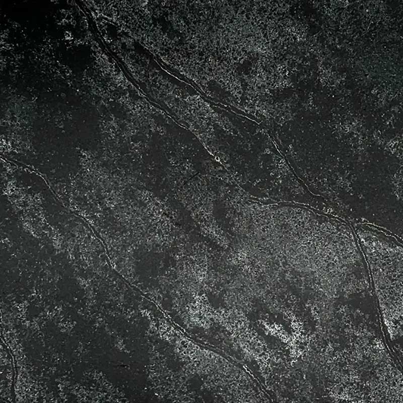 This quartz features a deep charcoal gray to black base with soft, flowing lighter veining, creating a moody and sophisticated surface with a subtle natural feel.
