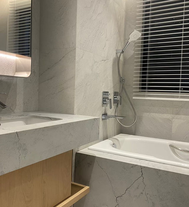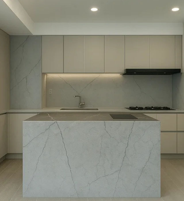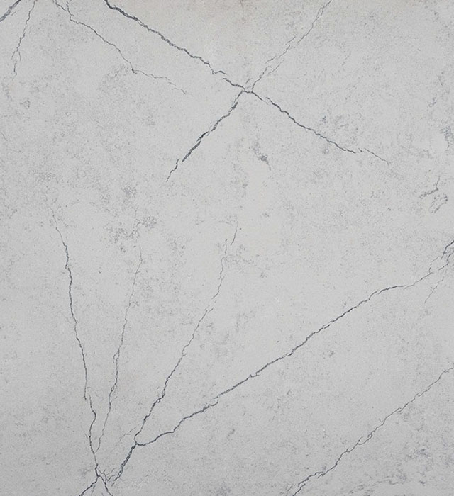 This quartz features a light off-white to pale gray base with delicate gray and charcoal veining, offering a soft and understated aesthetic with a hint of natural texture and very low contrast.