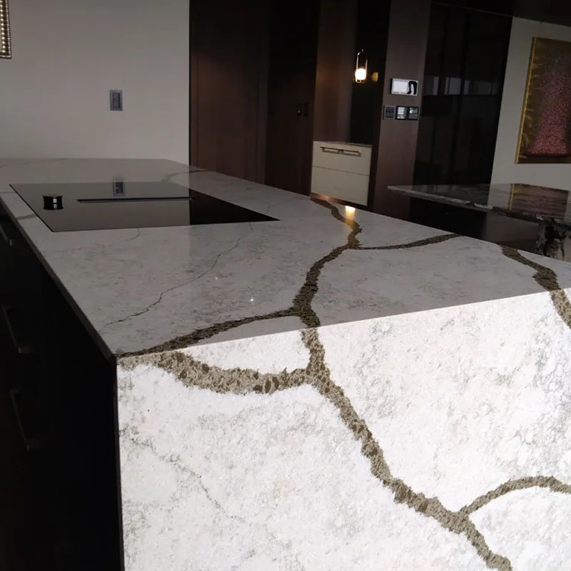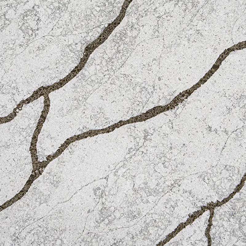 This quartz features an off-white base with bold, irregular dark brown and gray veining, creating a natural and rustic aesthetic with a strong visual impact.