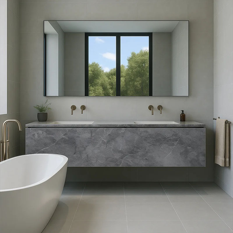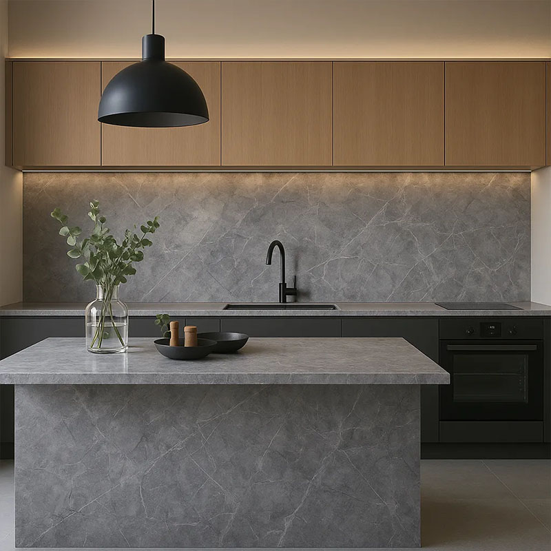 This quartz features a deep gray base with subtle veining and tonal shifts, creating a sophisticated and natural stone aesthetic.