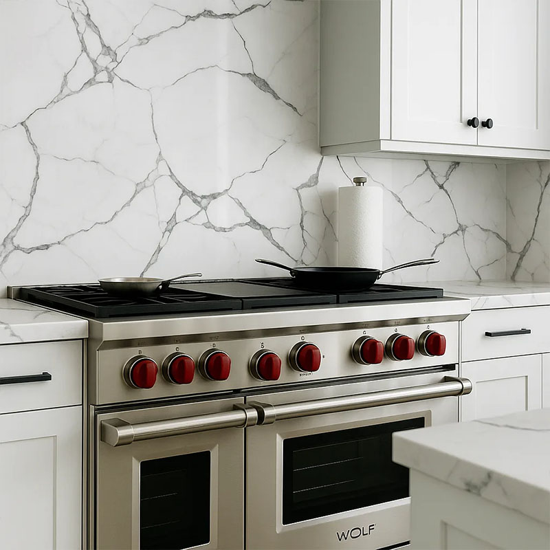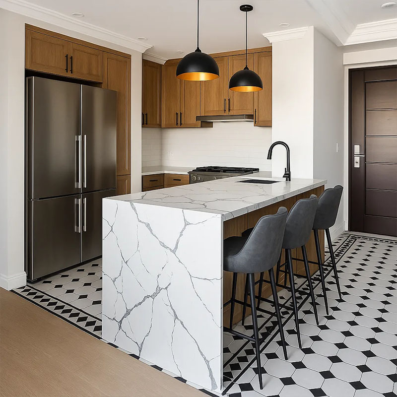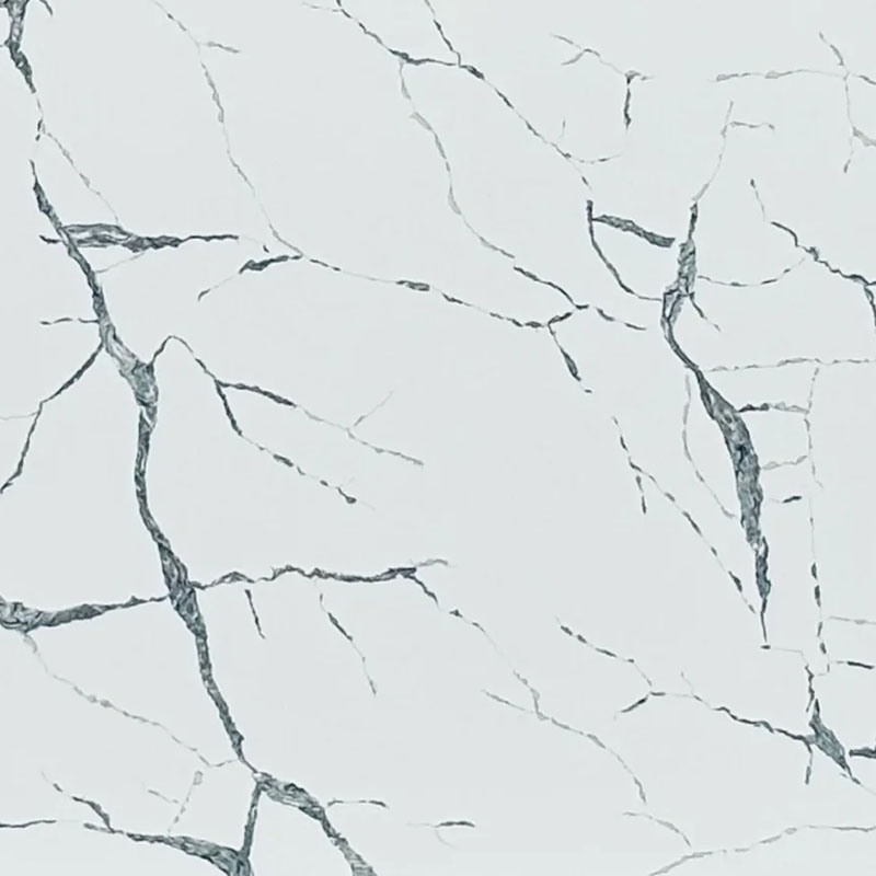 This quartz features a bright white base with bold, irregular dark gray and charcoal veining, creating a modern and dramatic aesthetic with a strong linear contrast.