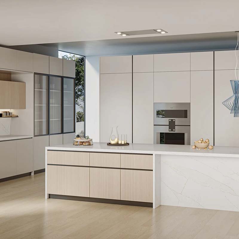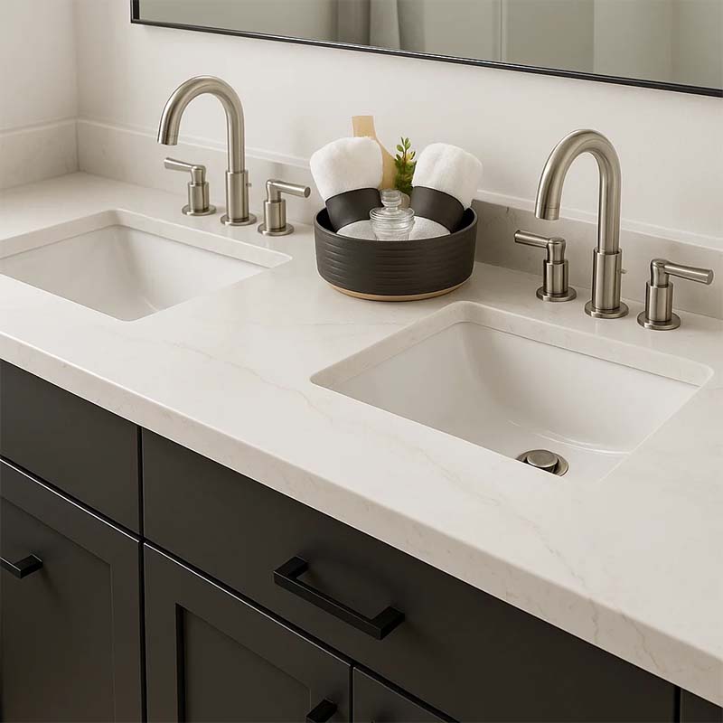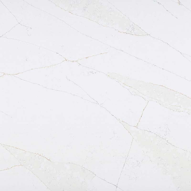 This quartz features a luminous white base interlaced with soft golden and taupe veining, evoking a sense of warmth and elegance. The delicate marbling flows organically across the surface, offering a luxurious yet subtle design perfect for both classic and contemporary interiors.