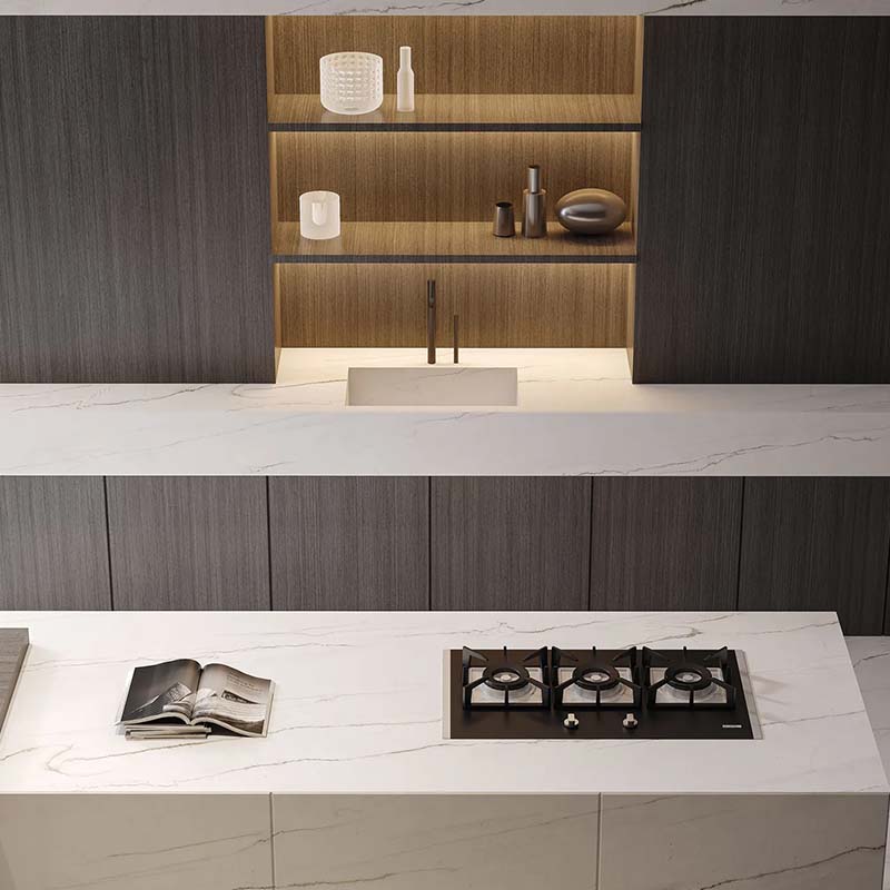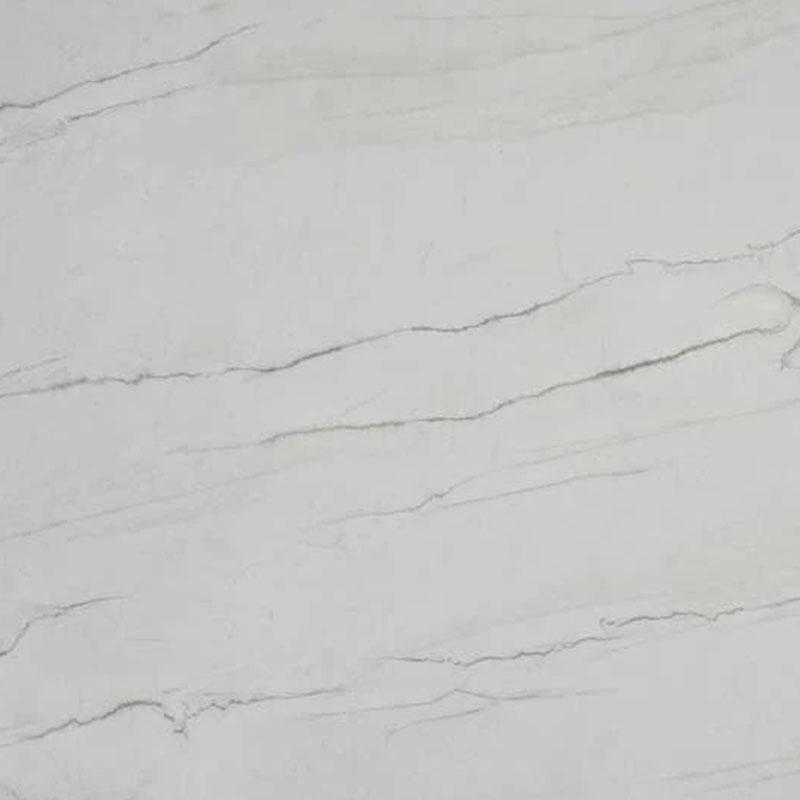 This quartz features a bright white base with delicate, flowing light to medium gray veining, offering a clean and sophisticated marble-inspired aesthetic with a subtle sense of movement.