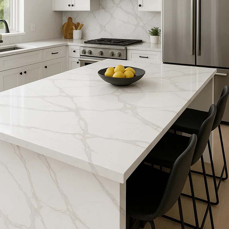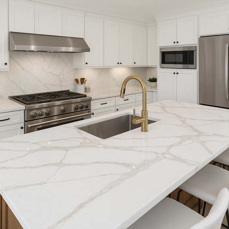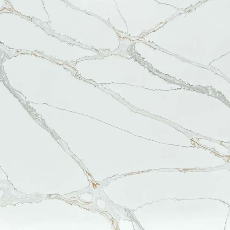 This quartz features a luminous white base accented with bold, flowing veins in soft gray and warm gold. Its elegant contrast and organic pattern add a touch of sophistication to any contemporary or classic design.