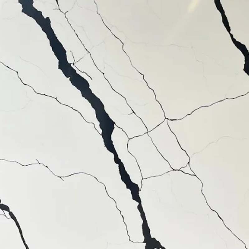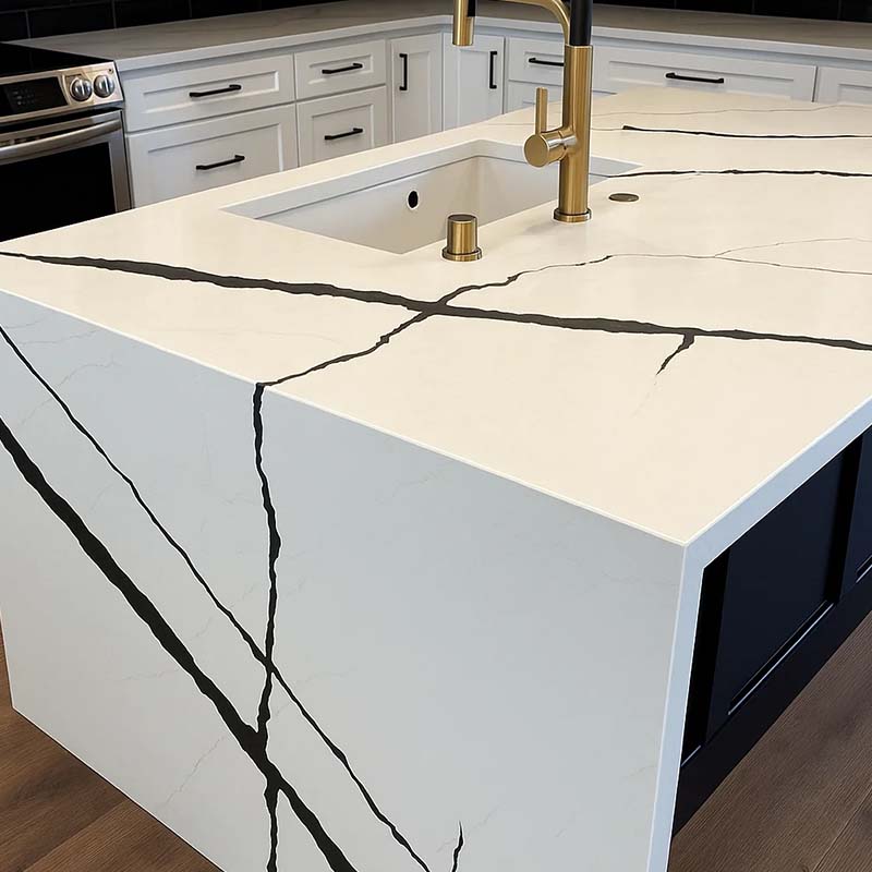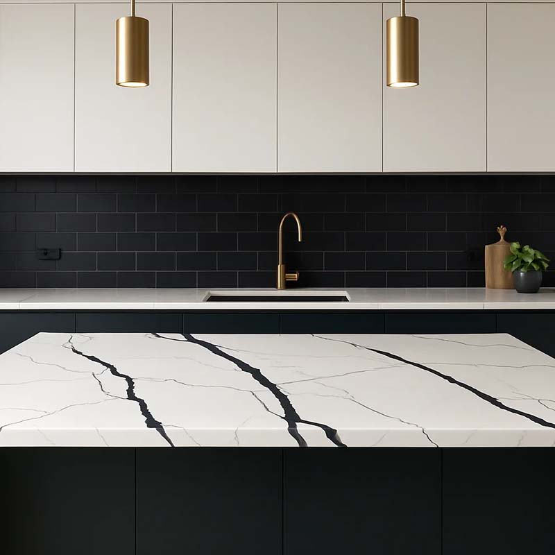 This quartz features a stark white base with bold, flowing black veins. The high contrast and dramatic pattern create a striking and modern statement.