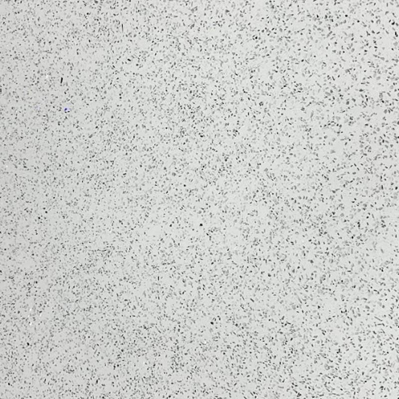 This quartz features a white base with a consistent distribution of small gray and black particles, creating a textured, modern, and subtly patterned surface.