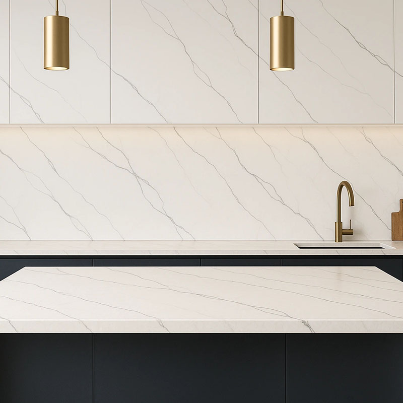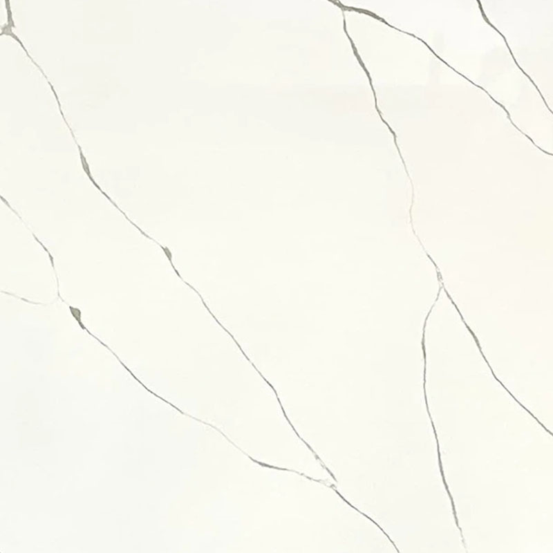 This quartz features a bright, warm white base with delicate, thin light gray veins that run in a mostly diagonal and random pattern, offering a clean look with subtle movement and low contra