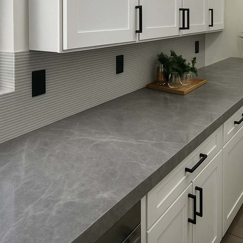 This quartz features a medium to dark gray base with fine, subtle lighter veining, creating a sleek and sophisticated look with a delicate texture.