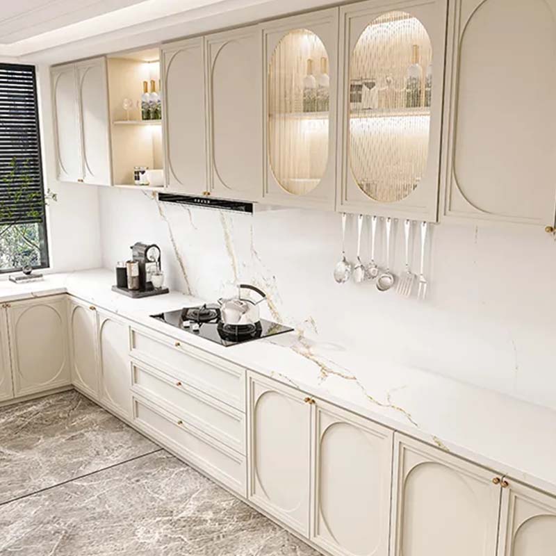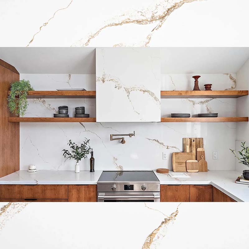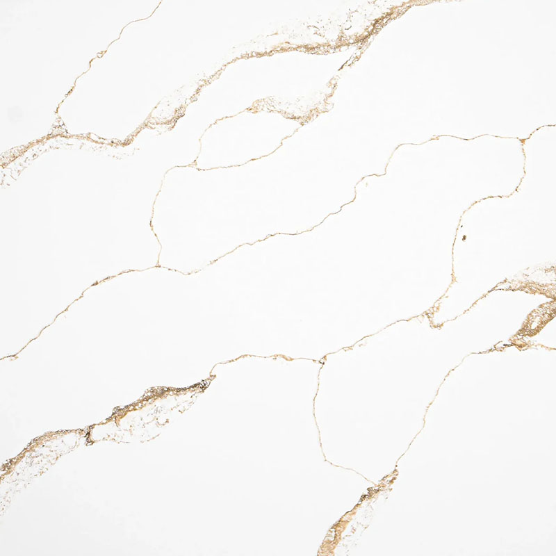 This quartz features a bright white base with flowing warm gold and light brown veining, creating a clean and luxurious aesthetic with elegant, soft-edged accents.