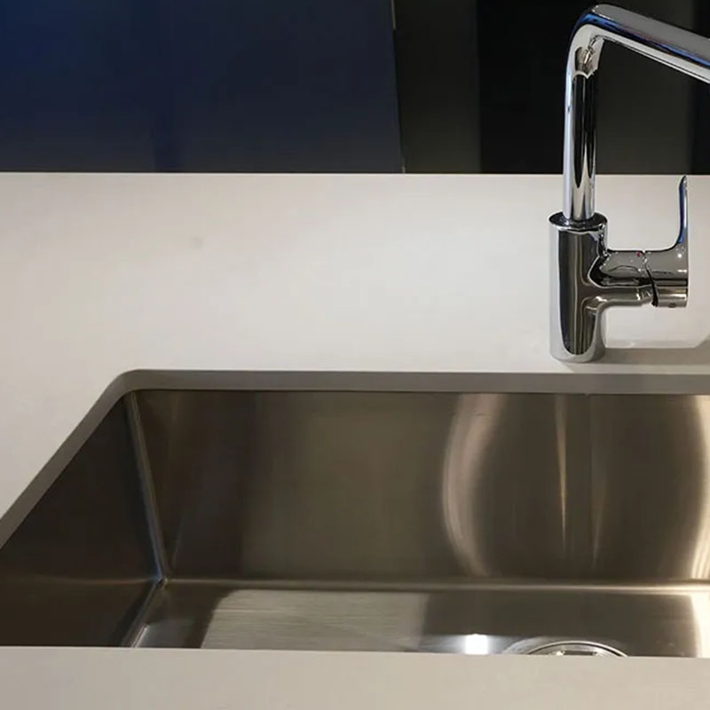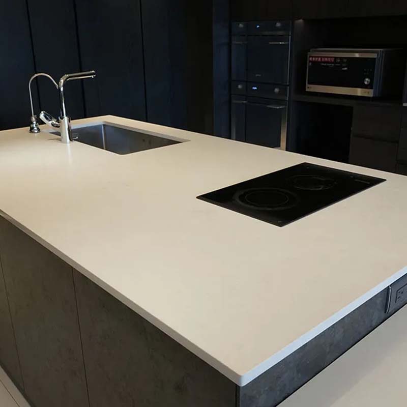 This quartz features a bright white base with very minimal and faint light gray veining and subtle cloudy movement, offering a clean and softly textured surface with a very subtle natural feel and minimal contrast.