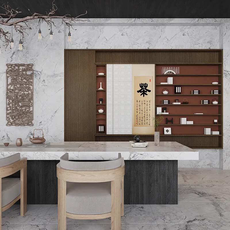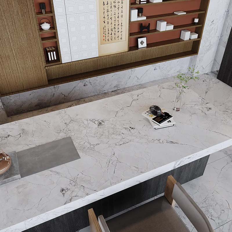 This quartz features a white base with a dense network of fine to medium gray veining, creating a classic marble aesthetic with a detailed and textured feel.