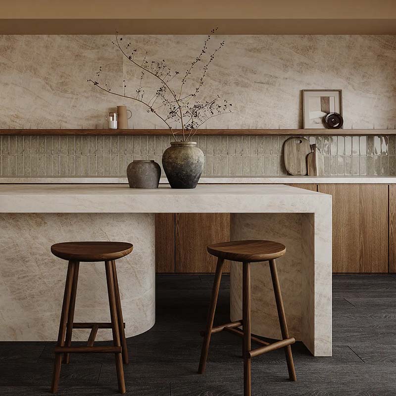 This quartz features a warm white to light beige base with soft, flowing light gray and cream patterns, creating a warm and elegant surface with a gentle, natural feel.