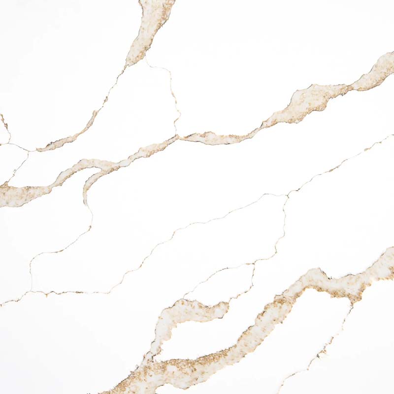 This quartz features a creamy white base with bold, irregular warm beige and light brown veining, exhibiting unique translucent areas that create a luxurious and organic aesthetic.