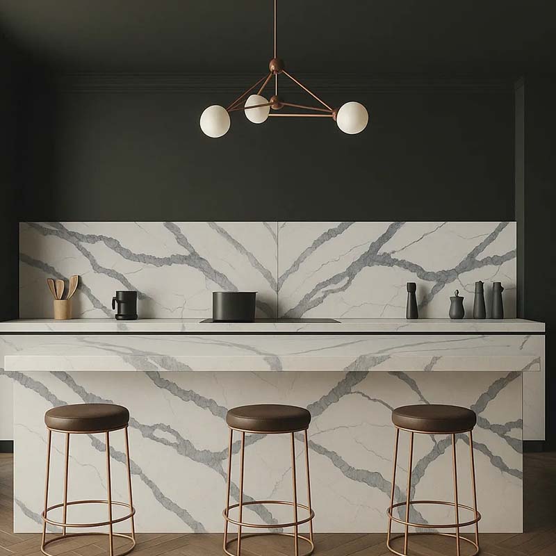 This quartz features a polished white canvas with bold, textured grey veining, delivering a dramatic and modern look ideal for impactful, design-forward spaces.